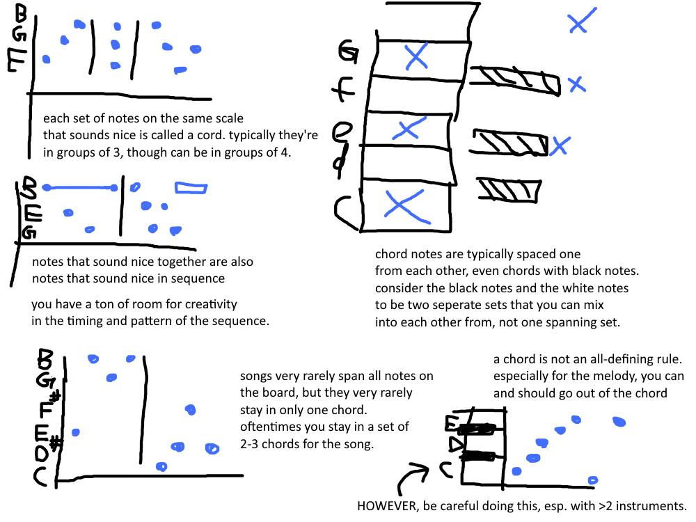 the next is on chords. chords are notes whose wavelengths compound in a nice way. Typically, they're in groups of 3, sometimes they're in groups of 4, and there's a lot to them that I don't know a ton about.