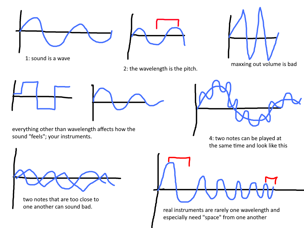 Two notes being played together compound the wavelength, and this is important, because for every note, there's a set of other notes that sound "good" with it. We hear in octaves, which are "groups" of wavelengths that sound very similar, though mathematically speaking, they scale of sound is logarithmic. C5 and C3 both sound like C, but they're very different; HOWEVER, C5 and E5 at the same time and C3 and E3 at the same time both compound with each other the same.