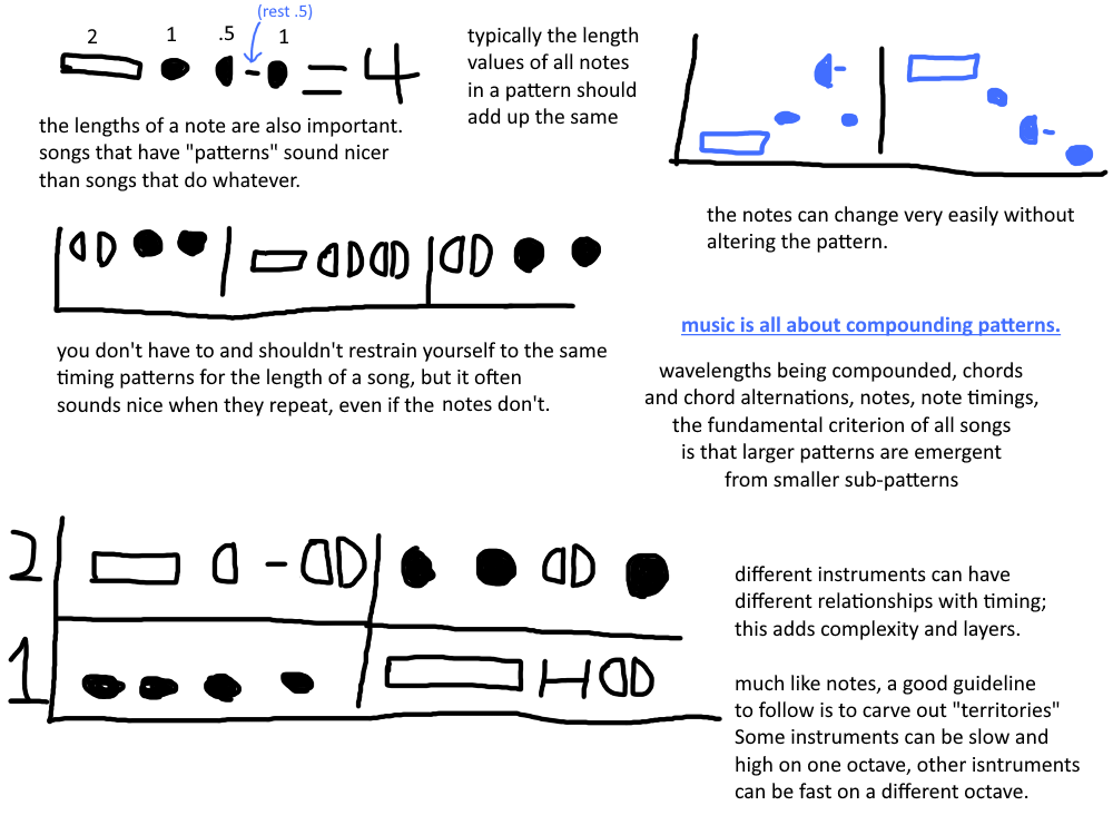 Timing is very important, and like notes, timing presents a vast array of choices. It's very easy to shoot yourself in the foot by completely ignoring timing patterns, especially if you're focusing too much on the notes. I don't have a lot to say that's not on the graphic here.